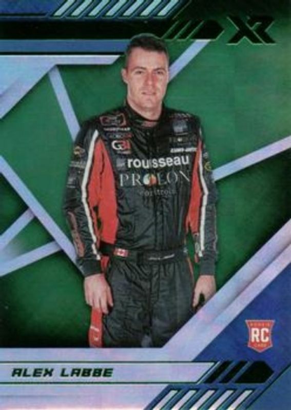 The Alex Labbe 2021 Chronicles NASCAR #20 XR - Green Rookie card is 1 of 51 Alex Labbe's card variations in the 2021 Chronicles NASCAR set being tracked by Sports Card Investor, including Base, Blue /199, Red /99, Purple /25, and Gold /10.