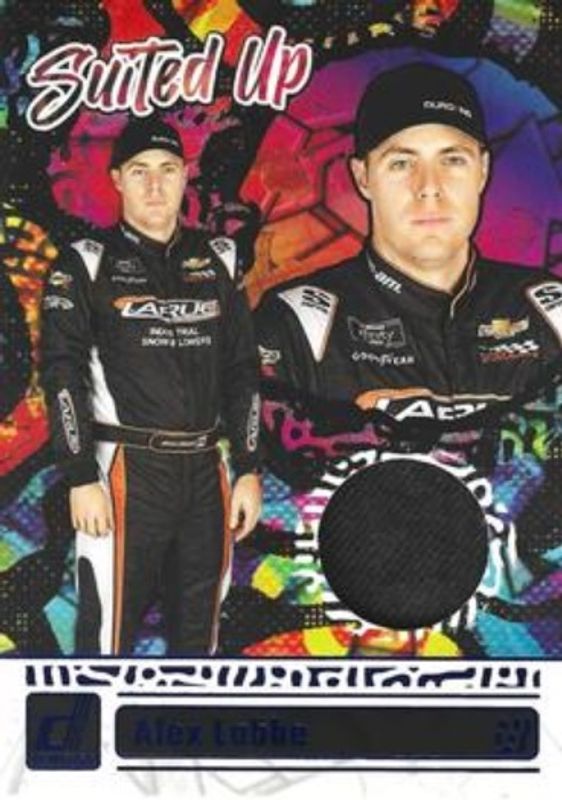 The Alex Labbe 2024 Donruss NASCAR #SU-AL Suited Up Swatches - Blue card is 1 of 44 Alex Labbe's card variations in the 2024 Donruss NASCAR set being tracked by Sports Card Investor, including Base, Optic, Optic Black Pandora, Optic Blue Velocity, and Optic Holo.