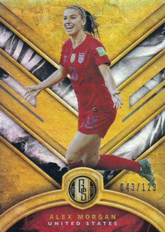 The Alex Morgan 2019 Gold Standard #12 Base /129 card is 1 of 17 Alex Morgan's card variations in the 2019 Gold Standard set being tracked by Sports Card Investor, including AU /79, Fine /29, Mint /19, Pure /1, and Dynamic /149.