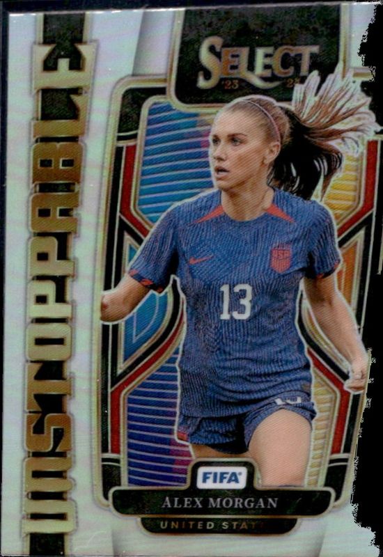 The Alex Morgan 2023 Select FIFA #2 Unstoppable Silver card is 1 of 41 Alex Morgan's card variations in the 2023 Select FIFA set being tracked by Sports Card Investor, including Base, Blue, Checkerboard, Green Ice, and Multi Color.