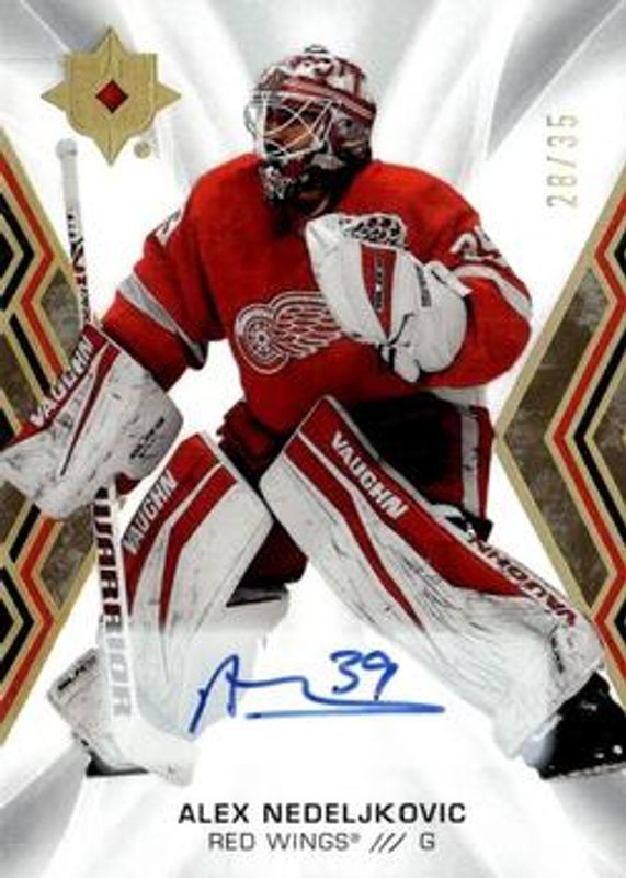 The Alex Nedeljkovic 2021 Upper Deck Ultimate Collection #33 Autographs - Gold /15 card is 1 of 24 Alex Nedeljkovic's card variations in the 2021 Upper Deck Ultimate Collection set being tracked by Sports Card Investor, including Base /299, Gold /35, Purple /15, Black /5, and 2000 Ultimate Signatures Retro.