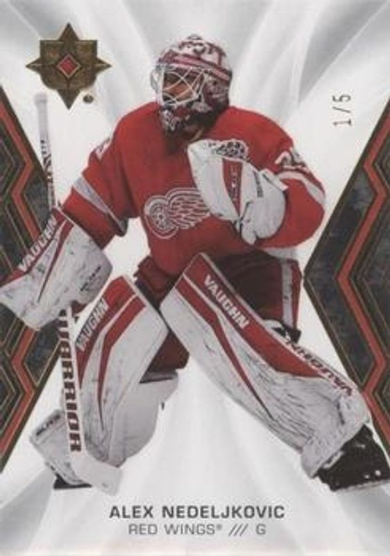 The Alex Nedeljkovic 2021 Upper Deck Ultimate Collection #33 Black /5 card is 1 of 24 Alex Nedeljkovic's card variations in the 2021 Upper Deck Ultimate Collection set being tracked by Sports Card Investor, including Base /299, Gold /35, Purple /15, 2000 Ultimate Signatures Retro, and Autographs.
