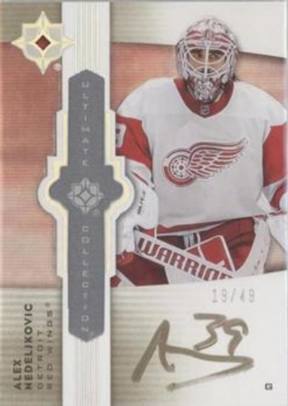 The Alex Nedeljkovic 2021 Upper Deck Ultimate Collection #UE-NE Ultimate Emblems - Auto Gold /49 card is 1 of 24 Alex Nedeljkovic's card variations in the 2021 Upper Deck Ultimate Collection set being tracked by Sports Card Investor, including Base /299, Gold /35, Purple /15, Black /5, and 2000 Ultimate Signatures Retro.