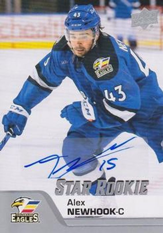 The Alex Newhook 2020 Upper Deck AHL #191 Autographs card is 1 of 8 Alex Newhook's card variations in the 2020 Upper Deck AHL set being tracked by Sports Card Investor, including Base, UD Exclusives /100, UD High Gloss /10, Printing Plates Black /1, and Printing Plates Cyan /1.