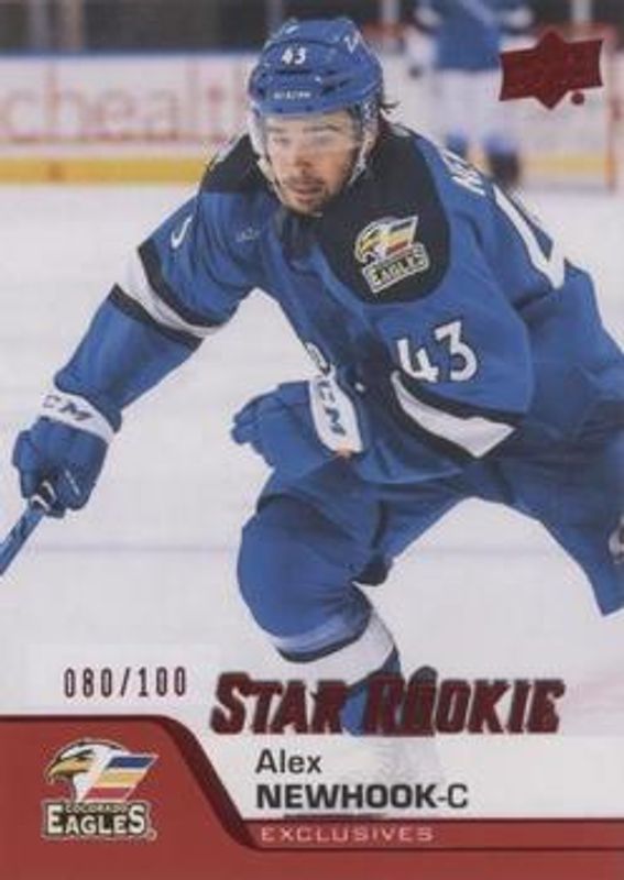 The Alex Newhook 2020 Upper Deck AHL #191 UD Exclusives /100 card is 1 of 8 Alex Newhook's card variations in the 2020 Upper Deck AHL set being tracked by Sports Card Investor, including Base, UD High Gloss /10, Autographs, Printing Plates Black /1, and Printing Plates Cyan /1.