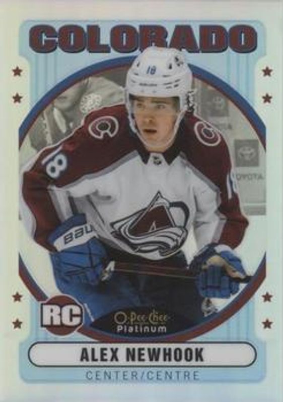 The Alex Newhook 2021 O-Pee-Chee Platinum #R-71 Retro Rainbow Rookie card is 1 of 48 Alex Newhook's card variations in the 2021 O-Pee-Chee Platinum set being tracked by Sports Card Investor, including Base, Black Shield (Marquee Rookies), Blue Surge, Matte Pink, and Neon Yellow Surge.
