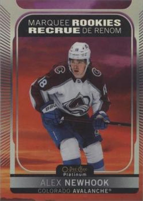 The Alex Newhook 2021 O-Pee-Chee Platinum #206 Sunset Rookie card is 1 of 48 Alex Newhook's card variations in the 2021 O-Pee-Chee Platinum set being tracked by Sports Card Investor, including Base, Black Shield (Marquee Rookies), Blue Surge, Matte Pink, and Neon Yellow Surge.