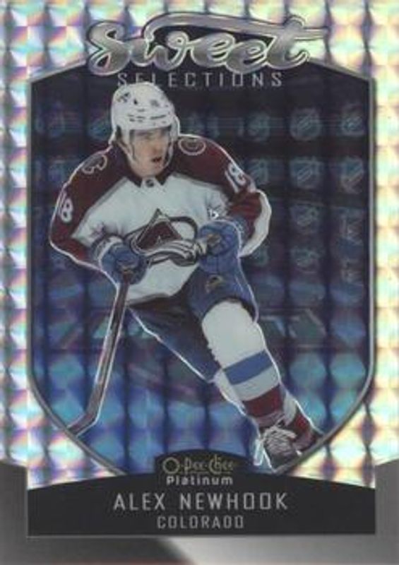 The Alex Newhook 2021 O-Pee-Chee Platinum #SS-1 Sweet Selections Mosaic Rookie card is 1 of 48 Alex Newhook's card variations in the 2021 O-Pee-Chee Platinum set being tracked by Sports Card Investor, including Base, Black Shield (Marquee Rookies), Blue Surge, Matte Pink, and Neon Yellow Surge.
