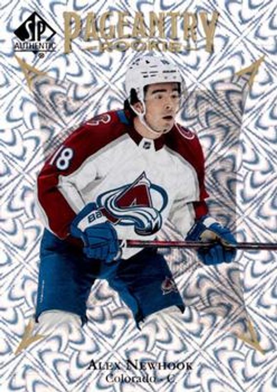 The Alex Newhook 2021 SP Authentic #P-61 Pageantry Rookie card is 1 of 24 Alex Newhook's card variations in the 2021 SP Authentic set being tracked by Sports Card Investor, including Black Autographs, Limited Red, Limited Gold /99, Future Watch Inscribed /50, and Limited Black /1.