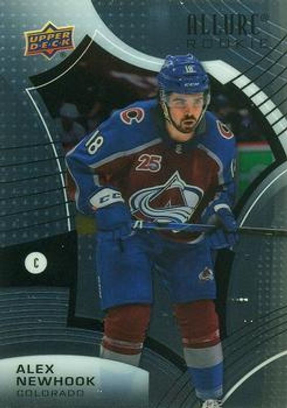 The Alex Newhook 2021 Upper Deck Allure #119 Base Rookie card is 1 of 49 Alex Newhook's card variations in the 2021 Upper Deck Allure set being tracked by Sports Card Investor, including 1917 Shield, 2005 Shield, Black Rainbow, Blue China, and Leopard.