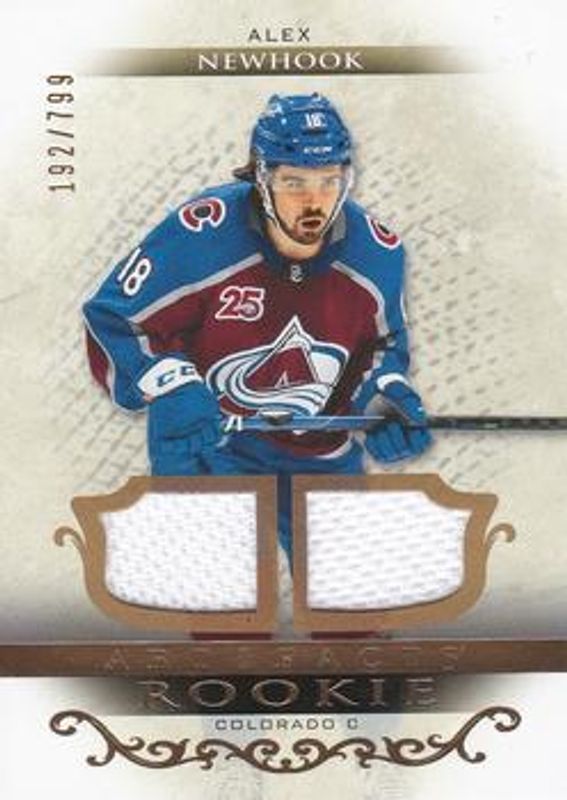 The Alex Newhook 2021 Upper Deck Artifacts #169 Material - Gold /199 Rookie card is 1 of 37 Alex Newhook's card variations in the 2021 Upper Deck Artifacts set being tracked by Sports Card Investor, including Base /999, Neon Green, Rose Gold, Turquoise, and Ruby /499.