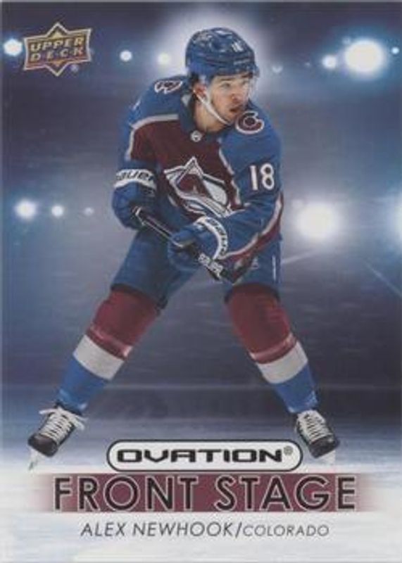 The Alex Newhook 2021 Upper Deck Ovation #FS-5 Front Stage Achievements Rookie card is 1 of 45 Alex Newhook's card variations in the 2021 Upper Deck Ovation set being tracked by Sports Card Investor, including Base, Checkerboard, Gold Circular Wonder, Gold Foil, and Silver Foil.