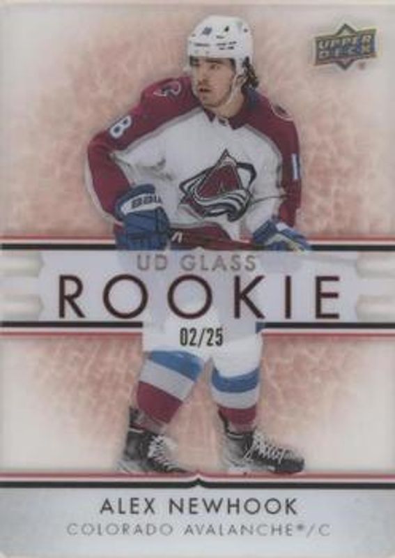 The Alex Newhook 2021 Upper Deck Ovation #GR-10 UD Glass Rookies - Red /25 card is 1 of 45 Alex Newhook's card variations in the 2021 Upper Deck Ovation set being tracked by Sports Card Investor, including Base, Checkerboard, Gold Circular Wonder, Gold Foil, and Silver Foil.