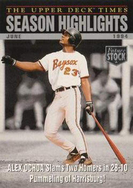 The Alex Ochoa 1995 Upper Deck Minor League #102 Future Stock Rookie card is 1 of 6 Alex Ochoa's card variations in the 1995 Upper Deck Minor League set being tracked by Sports Card Investor, including #102 Base, #3 Base, #3 Future Stock, Autographs, and #OP~2 Organizational Profiles.