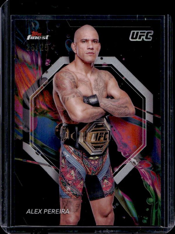 The Alex Pereira 2024 Topps Finest UFC #12 Black Refractor card is 1 of 79 Alex Pereira's card variations in the 2024 Topps Finest UFC set being tracked by Sports Card Investor, including #12 Base, #101 Base, #101 Aqua Glitter Refractor, #12 Aqua Glitter Refractor, and #101 Black Refractor.