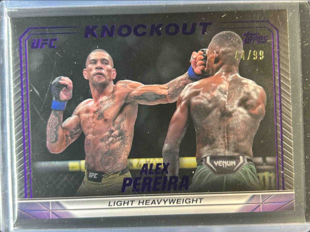 The Alex Pereira 2024 Topps Knockout UFC #33 Purple /99 card is 1 of 45 Alex Pereira's card variations in the 2024 Topps Knockout UFC set being tracked by Sports Card Investor, including Base, Orange, Bronze /250, Holo Silver /125, and Blue /50.