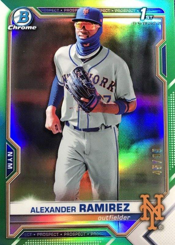The Alex Ramirez 2021 Bowman Chrome #BCP-208 Prospects - Green Refractor /99 (1st) card in Raw condition has not changed in price in the last 30 days and was last sold for $15.19 .