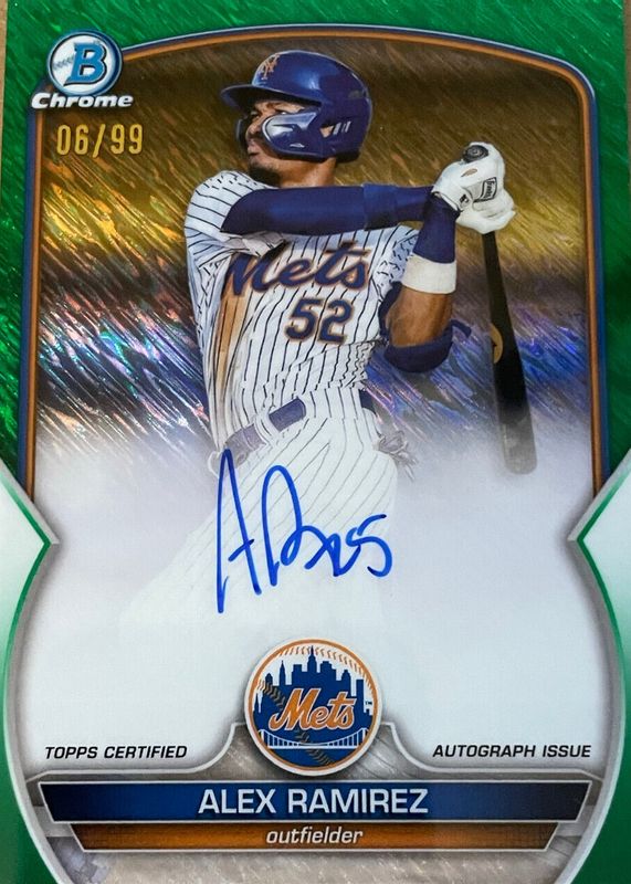 The Alex Ramirez 2023 Bowman #CPA-AR Chrome Prospect Auto - Green Shimmer Refractor /99 card in Raw condition has not changed in price in the last 30 days and was last sold for $39.00 .