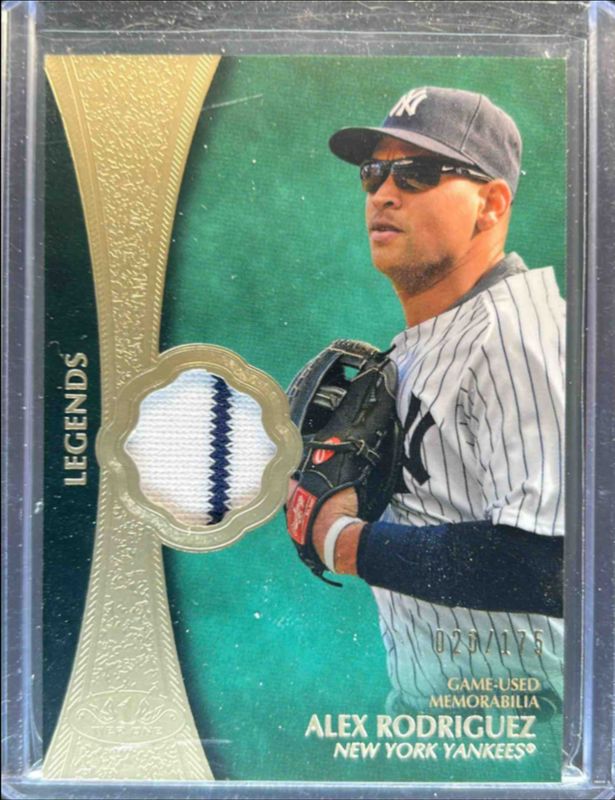 The Alex Rodriguez 2019 Topps Tier One #T1RL-AR Legends Relics /175 card is 1 of 15 Alex Rodriguez's card variations in the 2019 Topps Tier One set being tracked by Sports Card Investor, including Prime Performers Autographs /100, Autographed Relics /30, Legends Relics Dual /25, Prime Performers Autographs - Bronze Ink /25, and Autographed Prodigious Patches /10.