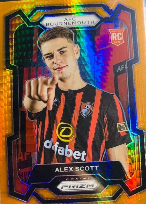 The Alex Scott 2023 Prizm Premier League #238 Orange Hyper Rookie card in Raw condition has not changed in price in the last 30 days and was last sold for $4.25 .