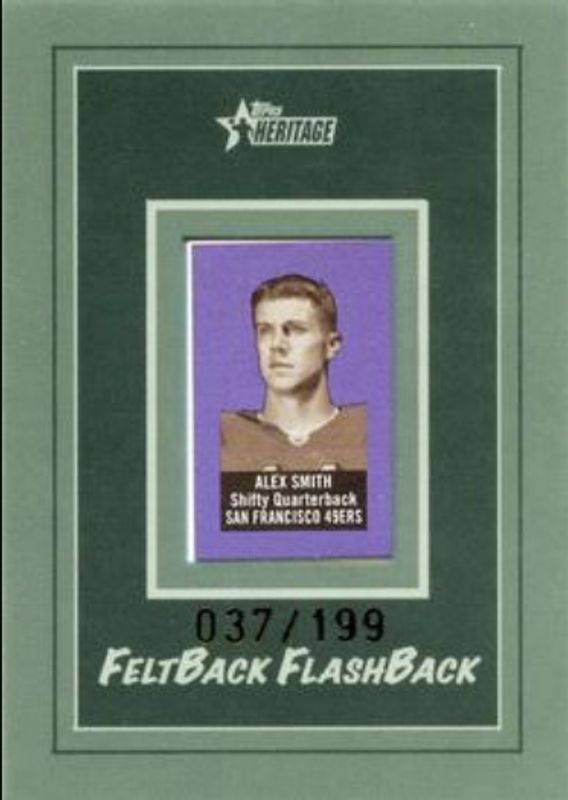 The Alex Smith 2005 Topps Heritage #11 Felt Back Flashback /199 Rookie card is 1 of 11 Alex Smith's card variations in the 2005 Topps Heritage set being tracked by Sports Card Investor, including #55a Base, #55b Base, #245 Base, #THC29a Foil, and #THC29b Foil.