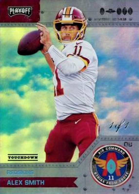 The Alex Smith 2018 Playoff #11 Air Command Strike from Above - Touchdown /1 card is 1 of 15 Alex Smith's card variations in the 2018 Playoff set being tracked by Sports Card Investor, including Base, Goal Line, Kickoff, Red Zone, and 1st Down /99.