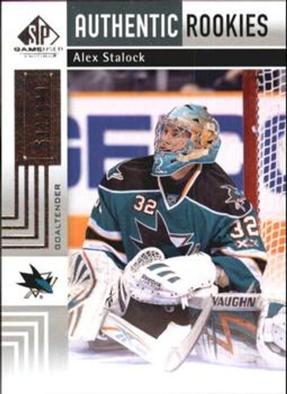The Alex Stalock 2011 SP Game Used #107 Base /699 Rookie card is 1 of 8 Alex Stalock's card variations in the 2011 SP Game Used set being tracked by Sports Card Investor, including Gold /50, Silver Spectrum /10, Gold Spectrum /1, Rookie Exclusives Autographs /100, and Letter Marks /50.