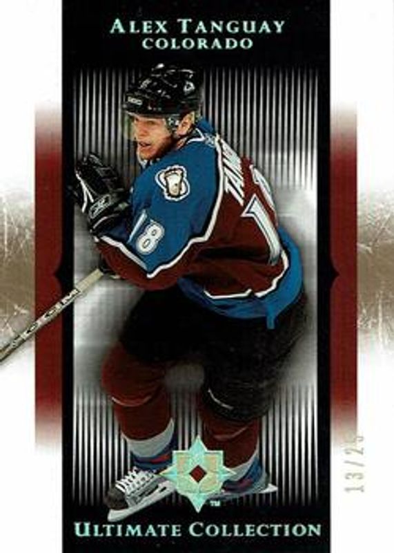 The Alex Tanguay 2005 Upper Deck Ultimate Collection #25 Gold /25 card is 1 of 7 Alex Tanguay's card variations in the 2005 Upper Deck Ultimate Collection set being tracked by Sports Card Investor, including Base /599, Ultimate Signatures, Marquee Attractions /250, Endorsed Emblems /35, and Ultimate Achievements /29.
