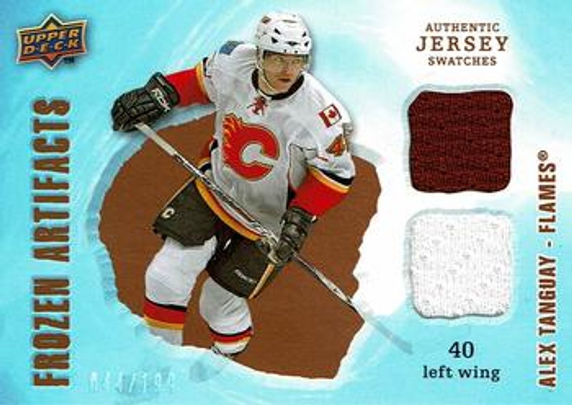 The Alex Tanguay 2008 Upper Deck Artifacts #FAD-AT Frozen Artifacts Dual /199 card is 1 of 17 Alex Tanguay's card variations in the 2008 Upper Deck Artifacts set being tracked by Sports Card Investor, including Base /999, Blue /50, Copper Spectrum /25, Gold Spectrum /5, and Frozen Artifacts Dual - Silver /100.