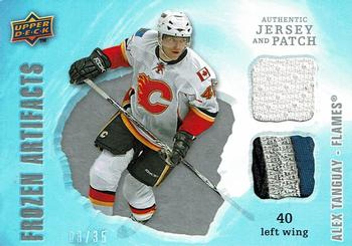 The Alex Tanguay 2008 Upper Deck Artifacts #FAD-AT Frozen Artifacts Jersey Patch Combo - Silver /35 card is 1 of 17 Alex Tanguay's card variations in the 2008 Upper Deck Artifacts set being tracked by Sports Card Investor, including Base /999, Blue /50, Copper Spectrum /25, Gold Spectrum /5, and Frozen Artifacts Dual /199.