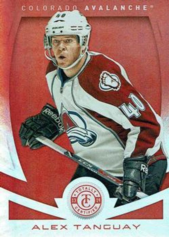 The Alex Tanguay 2013 Totally Certified #105 Mirror Platinum Red /25 card is 1 of 18 Alex Tanguay's card variations in the 2013 Totally Certified set being tracked by Sports Card Investor, including Base, Platinum Red /100, Platinum Blue /50, Mirror Platinum Purple /35, and Platinum Gold /25.