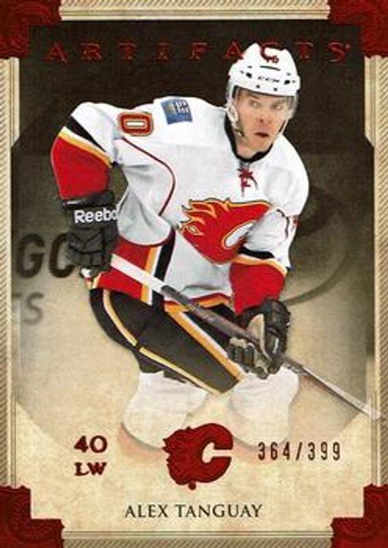 The Alex Tanguay 2013 Upper Deck Artifacts #3 Ruby /299 card is 1 of 12 Alex Tanguay's card variations in the 2013 Upper Deck Artifacts set being tracked by Sports Card Investor, including Base /899, Emerald /99, Sapphire /85, Spectrum /25, and Black /5.