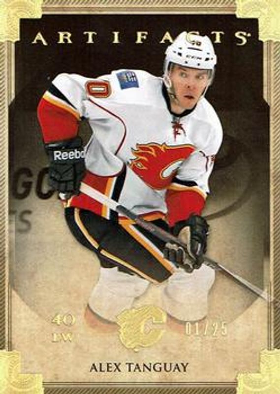 The Alex Tanguay 2013 Upper Deck Artifacts #3 Spectrum /25 card is 1 of 12 Alex Tanguay's card variations in the 2013 Upper Deck Artifacts set being tracked by Sports Card Investor, including Base /899, Ruby /299, Emerald /99, Sapphire /85, and Black /5.