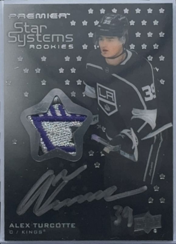 The Alex Turcotte 2021 Upper Deck Premier #SSR-AT Star Systems Rookies - Auto Patch /149 card is 1 of 30 Alex Turcotte's card variations in the 2021 Upper Deck Premier set being tracked by Sports Card Investor, including Base /399, Gold /199, Bronze /65, Purple /10, and Platinum /1.