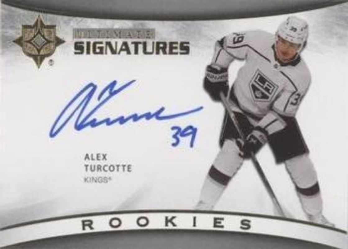 The Alex Turcotte 2021 Upper Deck Ultimate Collection #USR-AT Ultimate Signatures Rookies card is 1 of 38 Alex Turcotte's card variations in the 2021 Upper Deck Ultimate Collection set being tracked by Sports Card Investor, including Base /299, 2000 Ultimate Signatures Retro, 2000 Ultimate Signatures Retro Rookies, Signatures Masterpieces, and Ultimate Emblems - Auto.