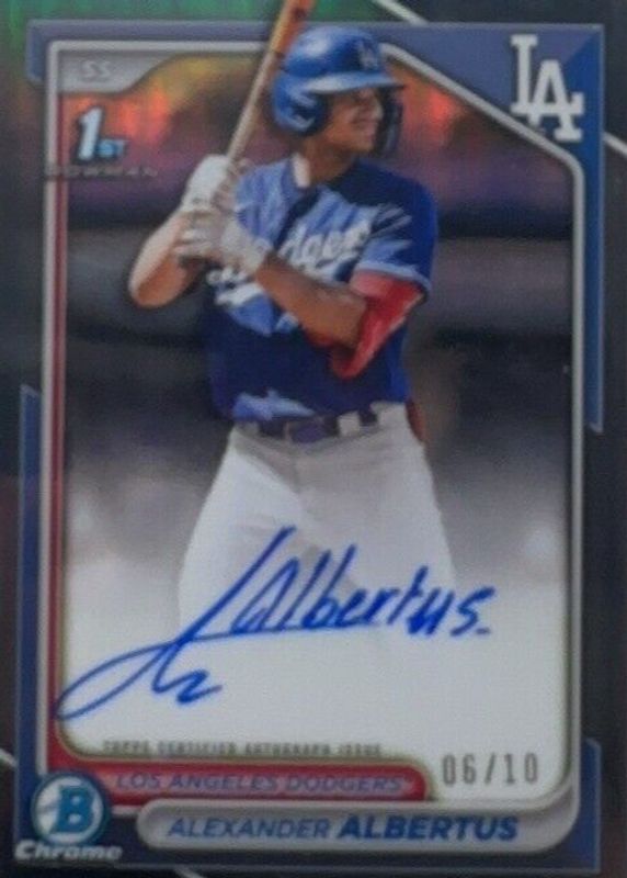 This card is 1 of 25 Alexander Albertus' card variations in the 2024 Bowman Chrome set being tracked by Sports Card Investor, including Prospect Auto (1st), Prospect Auto - Refractor /499 (1st), Prospect Auto - Speckle Refractor /299 (1st), Prospect Auto - Purple Refractor /250 (1st), and Prospect Auto - Blue RayWave Refractor /150 (1st).