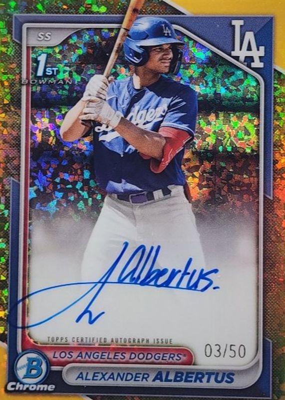 This card is 1 of 25 Alexander Albertus' card variations in the 2024 Bowman Chrome set being tracked by Sports Card Investor, including Prospect Auto (1st), Prospect Auto - Refractor /499 (1st), Prospect Auto - Speckle Refractor /299 (1st), Prospect Auto - Purple Refractor /250 (1st), and Prospect Auto - Blue RayWave Refractor /150 (1st).