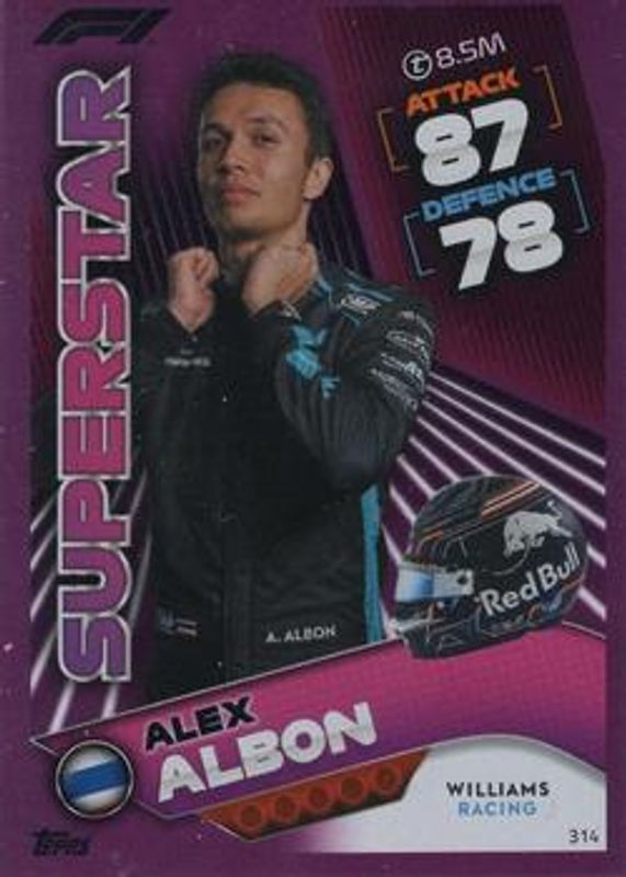 The Alexander Albon 2022 Topps Turbo Attax Formula 1 #314 Mirror Foil Pink card is 1 of 24 Alexander Albon's card variations in the 2022 Topps Turbo Attax Formula 1 set being tracked by Sports Card Investor, including #151 Base, #81 Base, #80 Base, #79 Base, and #359 Base.