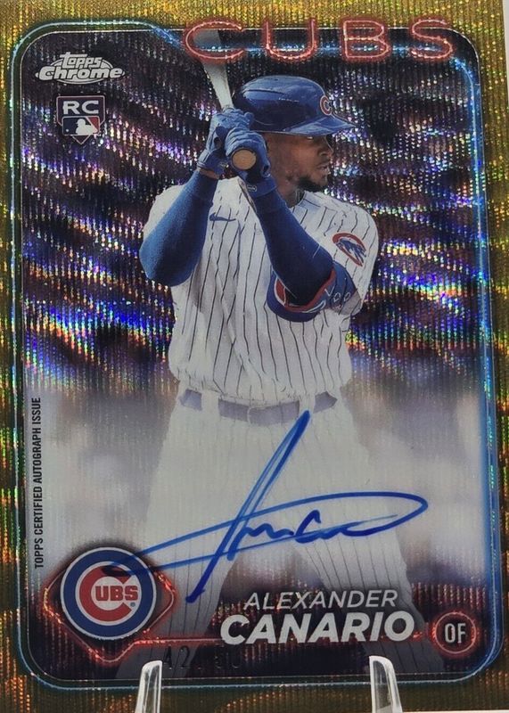 The Alexander Canario 2024 Topps Chrome #RA-AC Rookie Autographs - Gold Wave Refractor /50 card in Raw condition has not changed in price in the last 30 days and was last sold for $17.50 .