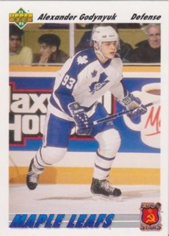 The Alexander Godynyuk 1991 Upper Deck #E16 Euro Stars Rookie card is 1 of 5 Alexander Godynyuk's card variations in the 1991 Upper Deck set being tracked by Sports Card Investor, including #466 Base, #609 Base, #E16a Euro Stars, and #E16b Euro Stars.