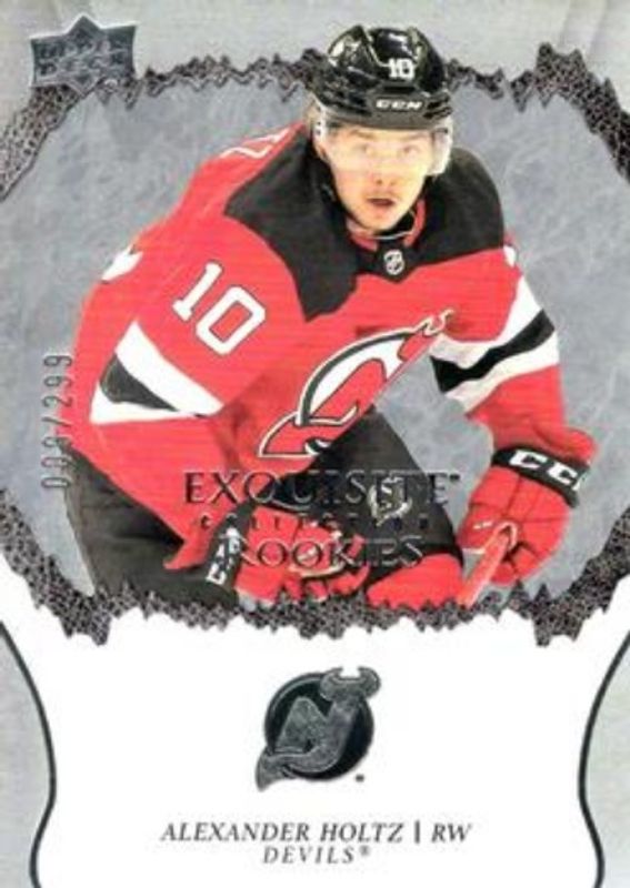 The Alexander Holtz 2021 Upper Deck Ice #R-40 Exquisite Collection Rookies /299 card is 1 of 34 Alexander Holtz's card variations in the 2021 Upper Deck Ice set being tracked by Sports Card Investor, including Base /999, Ice Blue, Jersey, Lavender, and Orange.