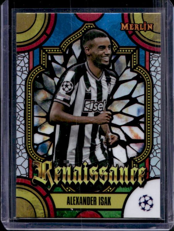 The Alexander Isak 2023 Topps Merlin Chrome UEFA Club Competitions #R-14 Renaissance card is 1 of 34 Alexander Isak's card variations in the 2023 Topps Merlin Chrome UEFA Club Competitions set being tracked by Sports Card Investor, including Base, Aqua Prism Refractor, Refractor, Vintage Merlin Refractor, and Neon Green Shimmer Refractor /399.