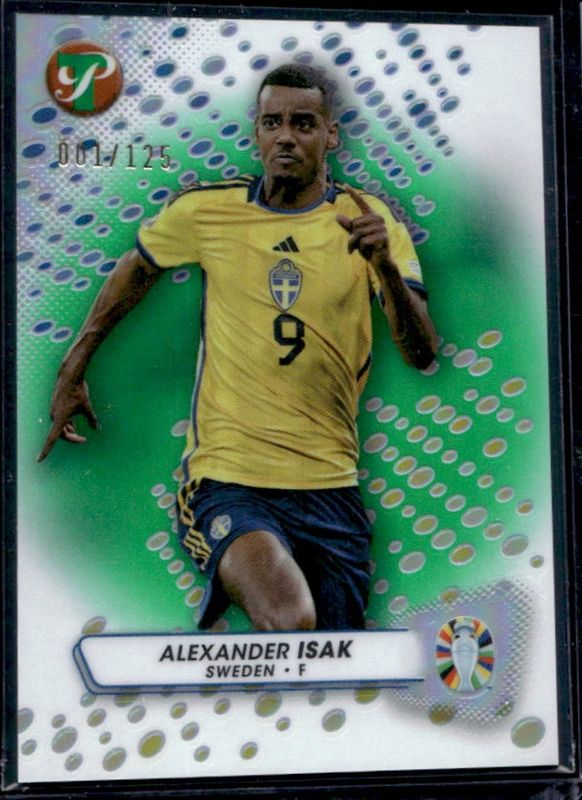 The Alexander Isak 2024 Topps Pristine Road to UEFA Euro #174 Green Refractor /125 card is 1 of 31 Alexander Isak's card variations in the 2024 Topps Pristine Road to UEFA Euro set being tracked by Sports Card Investor, including Base, Pristine Refractor, Refractor, Purple Refractor /99, and Blue Pristine Refractor /75.