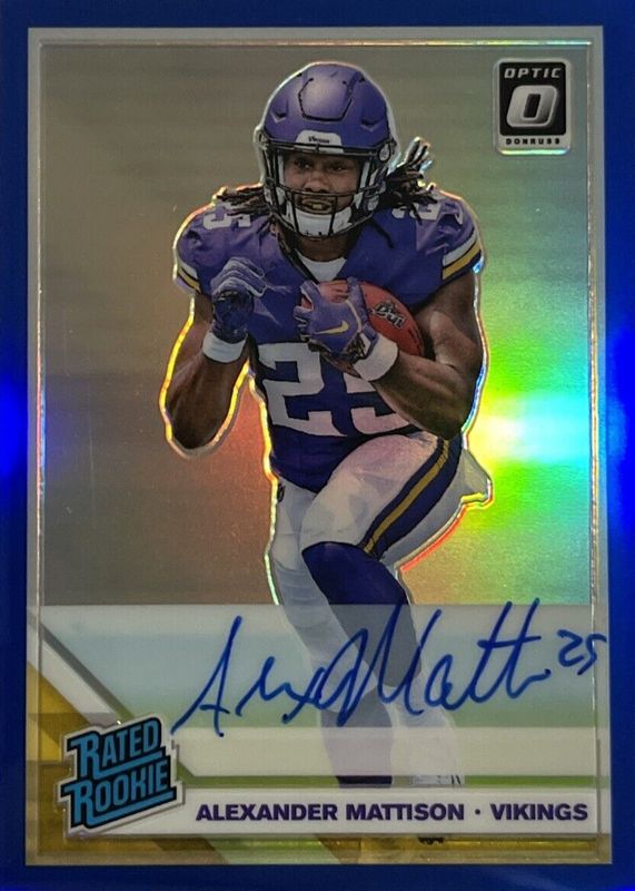 The Alexander Mattison 2019 Optic #181 Rated Rookie Autographs - Blue (/75) card in Raw condition has not changed in price in the last 30 days and was last sold for $5.00 .