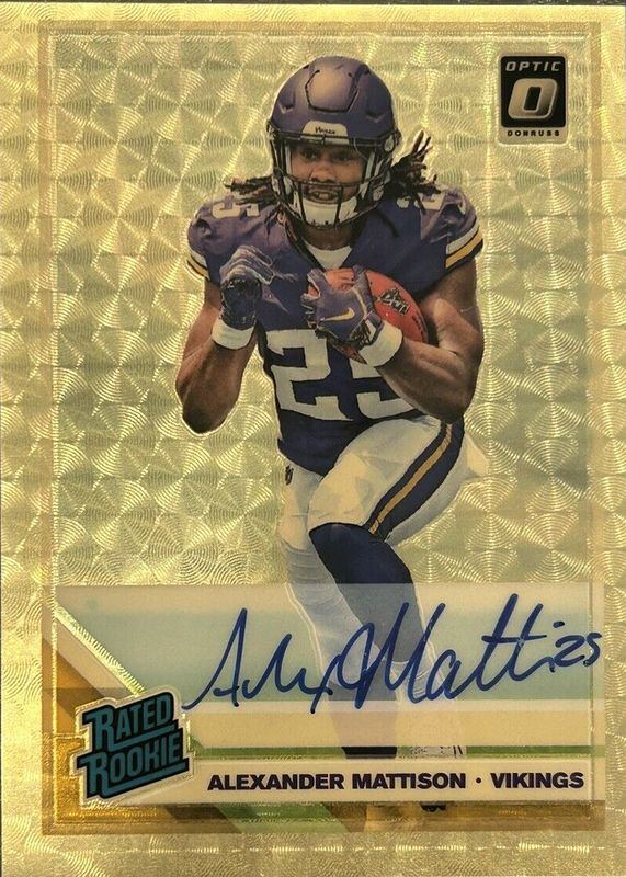 The Alexander Mattison 2019 Optic #181 Rated Rookie Autographs - Gold Vinyl /1 card in Raw condition has not changed in price in the last 30 days and was last sold for $201.00 .