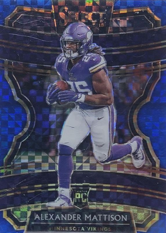 This card is 1 of 35 Alexander Mattison's card variations in the 2019 Select set being tracked by Sports Card Investor, including Concourse, Field Level, Concourse Silver, Field Level Silver, and Concourse Tri-Color /199.