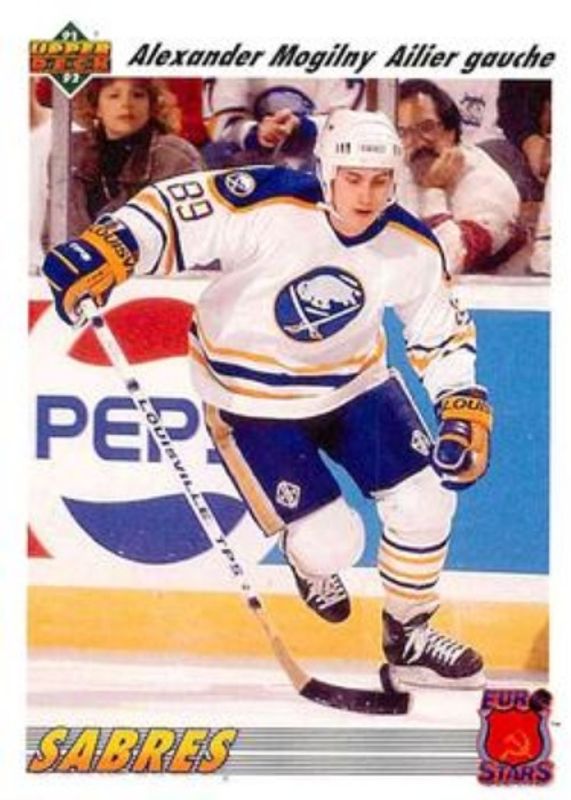 The Alexander Mogilny 1991 Upper Deck French #E2a Euro Stars card is 1 of 2 Alexander Mogilny's card variations in the 1991 Upper Deck French set being tracked by Sports Card Investor, including Euro Stars.