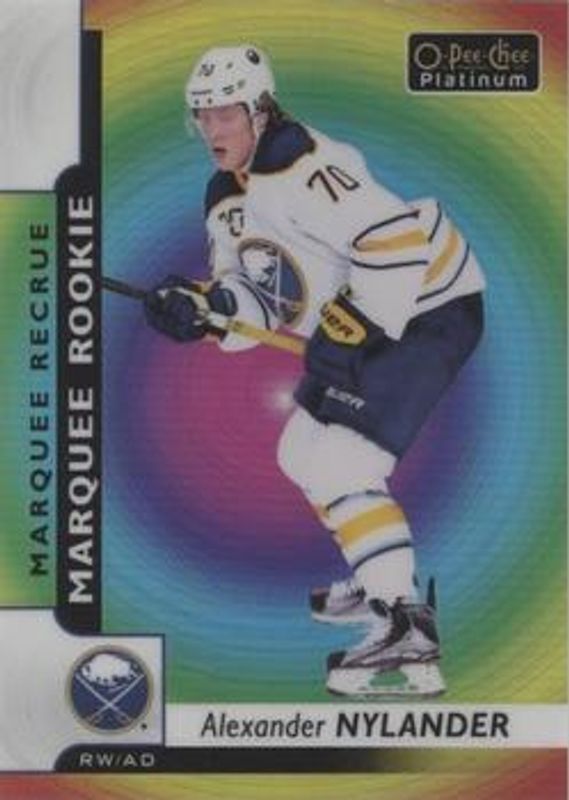 The Alexander Nylander 2017 O-Pee-Chee Platinum #180 Rainbow Color Wheel Rookie card is 1 of 29 Alexander Nylander's card variations in the 2017 O-Pee-Chee Platinum set being tracked by Sports Card Investor, including Base, Rainbow, Violet Pixels, Red Prism /199, and Royal Blue Cubes /99.