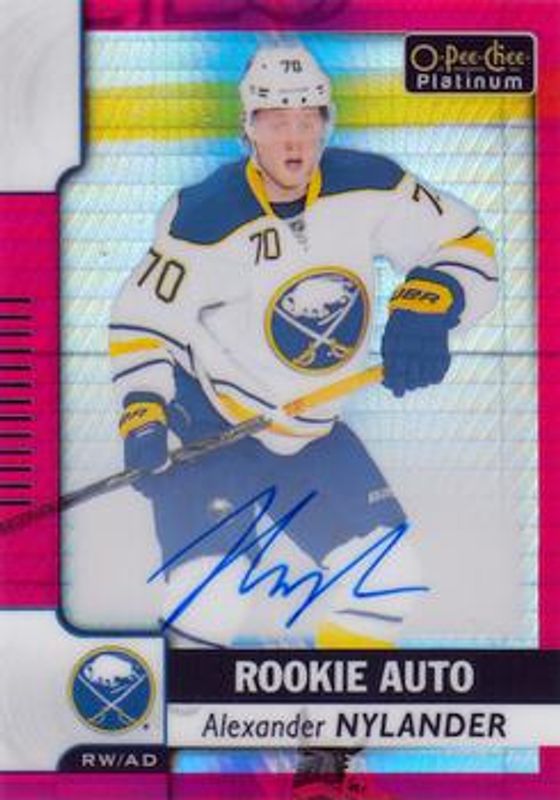 The Alexander Nylander 2017 O-Pee-Chee Platinum #R-AN Rookie Autographs: Red Prism /50 card is 1 of 29 Alexander Nylander's card variations in the 2017 O-Pee-Chee Platinum set being tracked by Sports Card Investor, including Base, Rainbow, Violet Pixels, Red Prism /199, and Royal Blue Cubes /99.
