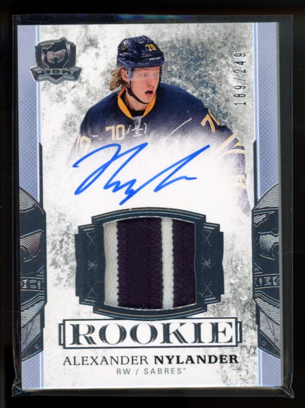 The Alexander Nylander 2017 Upper Deck The Cup #124 Base /249 Rookie card is 1 of 83 Alexander Nylander's card variations in the 2017 Upper Deck The Cup set being tracked by Sports Card Investor, including Rookies Gold Spectrum /4, Black Foil Shield /1, Rookies Printing Plates Black /1, Rookies Printing Plates Cyan /1, and Rookies Printing Plates Magenta /1.